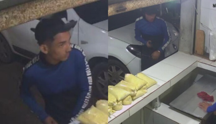 Imagens de câmeras de segurança, mostram o suspeito se preparando para o assalto e apontando a arma para a parte interna de uma banca com farinhas. A vítima se aproxima e primeiro entrega seu celular, depois parte da renda dentro do caixa.