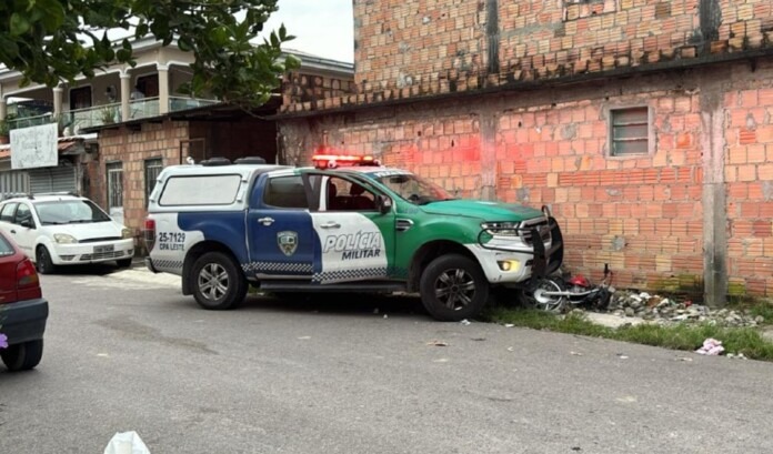 Uma dupla não identificada, acabou colidindo contra um muro na manhã desta segunda-feira (4), na Travessa Verão, no Ouro Verde, Zona Leste de Manaus.