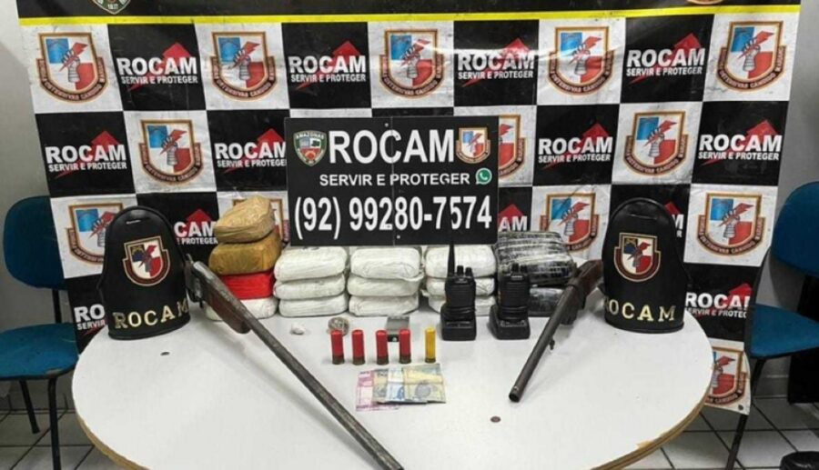 Foram apreendidos doze tabletes de oxi, dois tabletes de maconha tipo skunk, duas porções de oxi, uma porção de skunk, uma garrucha calibre 36, uma espingarda, além de cinco munições de diferentes calibres, uma balança de precisão, dois rádios comunicadores com base e carregador.