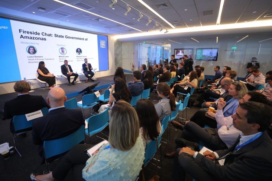 O governador do Amazonas esteve acompanhado do secretário estadual de Meio Ambiente, Eduardo Taveira, em encontro moderado pela chefe de transição energética da BloombergNEF, Luiza Demôro.
