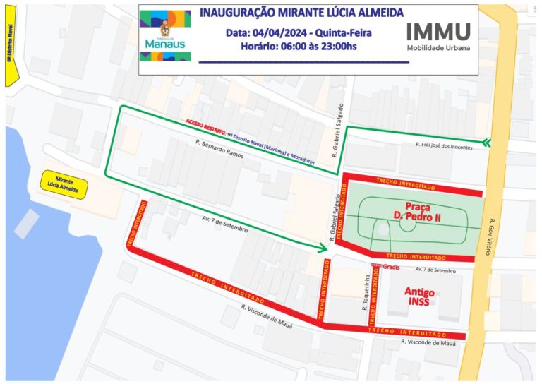 Inauguração do mirante Lúcia Almeida e o Largo de São Vicente, altera trânsito no Centro de Manaus nesta quinta-feira (4).