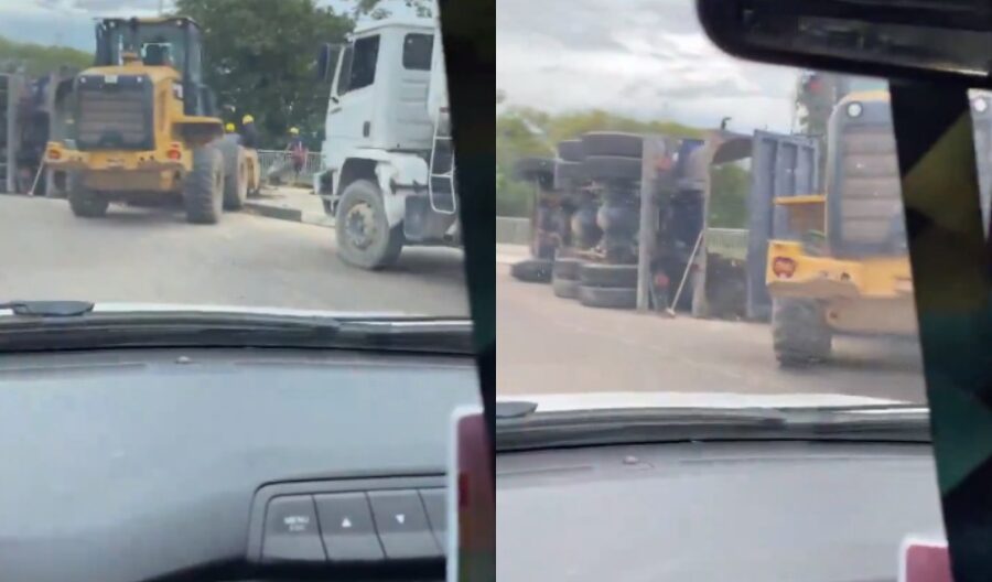 Segundo informações, o veículo estaria transportando entulhos quando tombou na via pública. Confira: