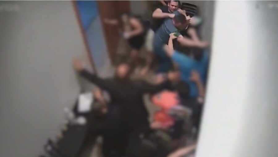 Ao ver a situação, o policial foi filmando questionando o homem e depois dando um soco nele, que revidou a agressão e iniciou uma confusão generalizada no estabelecimento. O policial, então, sacou a arma e fez um disparo, mas acabou atingindo a funcionária que trabalhava na recepção.