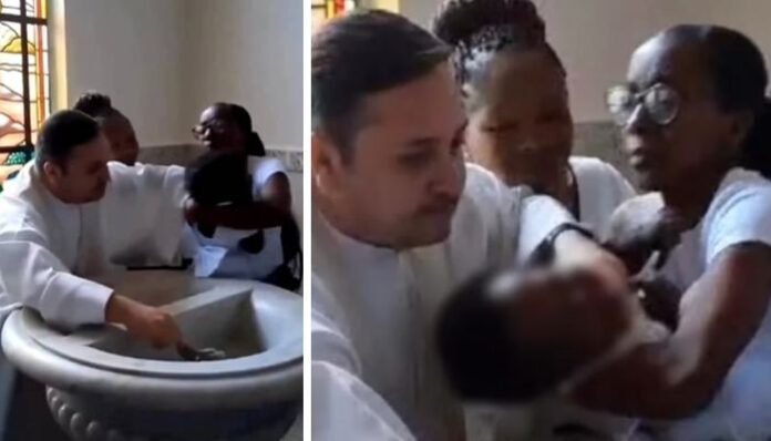 Padre dá puxão em criança que chorava no colo da mãe durante o batismo.