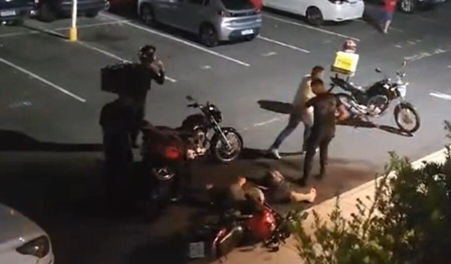 Nas imagens é possível ver o morador atingindo a moto do entregador que reage. O homem é empurrado e acaba sendo agredido por outros entregadores que estão no local.