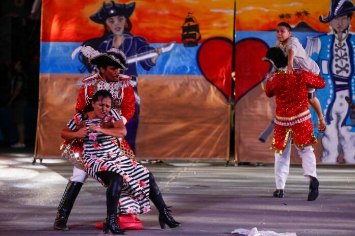 Este ano, a apresentação homenageou a força das mulheres, especialmente das mães, situando o espetáculo em uma ficção que se passa na época dos piratas, destacando a figura de uma mulher como capitã do navio Pérola Negra.