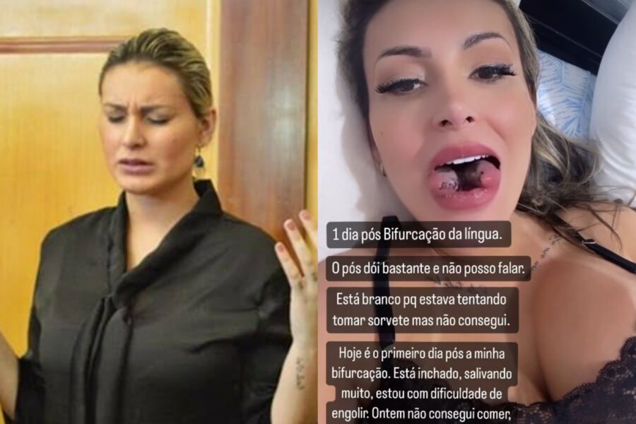 “Um dia pós-bifurcação da língua! Está doendo, inchado, não consigo falar, salivando bastante. Dificuldade de engolir. Consegui hoje tomar sopa batida no liquidificador, tentei tomar sorvete, mas não consegui”, escreveu Andressa, que tem lucrado com conteúdos em plataformas adultas.