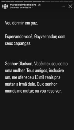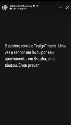 “Uma vez o senhor me levou para o seu apartamento em Brasília e me abusou. E vou provar!”, declarou. “Eu fui bolinado pelo governador do Acre” finalizou o influencer. Confira a sequência de prints postadas por ele via Instagram: