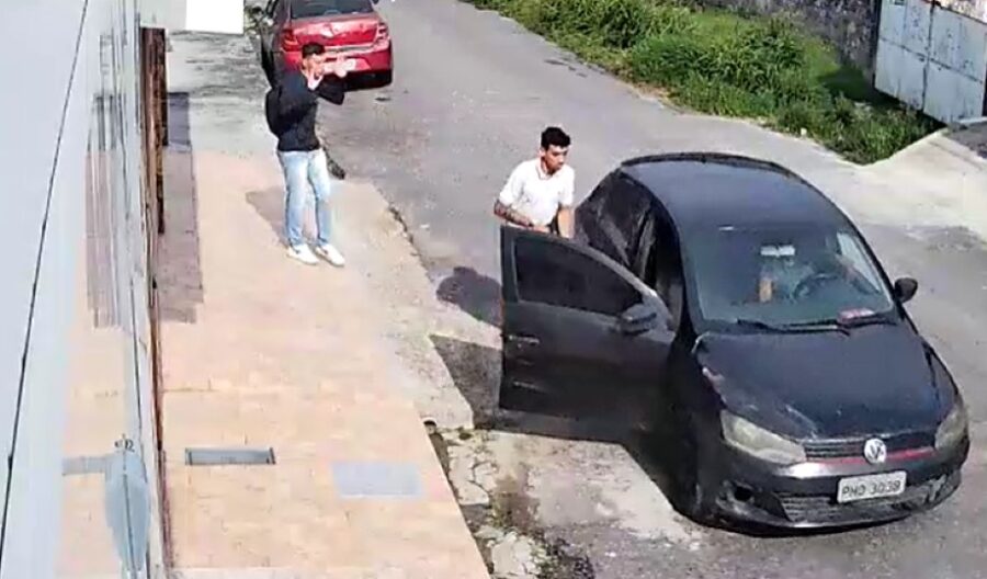 Imagens de câmeras de vigilância mostram o momento em que a vítima está caminhando e um carro para e logo em seguida um homem armado desce e toma o celular do jovem. Confira: