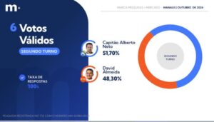 O levantamento mostra o candidato do PL liderando com 51,7% dos votos válidos, contra 48,3% do atual prefeito David Almeida (Avante). Os votos válidos excluem os brancos e nulos.