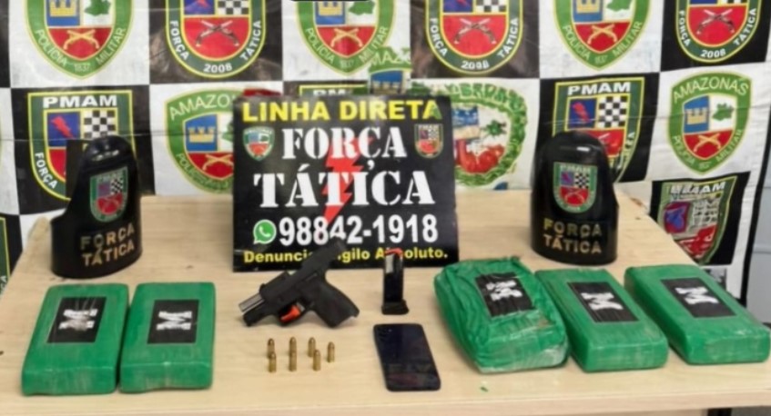 Na tarde do último sábado (2), a polícia capturou um foragido da Justiça e apreendeu cinco tabletes de cocaína e uma arma de fogo no conjunto Viver Melhor, zona norte de Manaus.