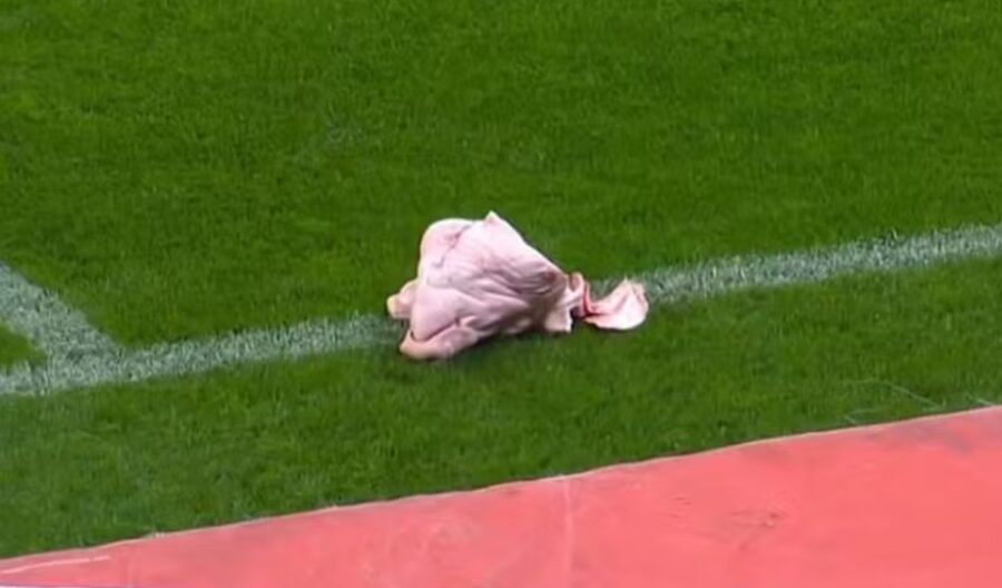 Foi no momento da cobrança de escanteio de Raphael Veiga, aos 28 minutos da etapa inicial, que o pedaço do animal morto precisou ser retirado da linha que divide o campo, por Yuri Alberto.