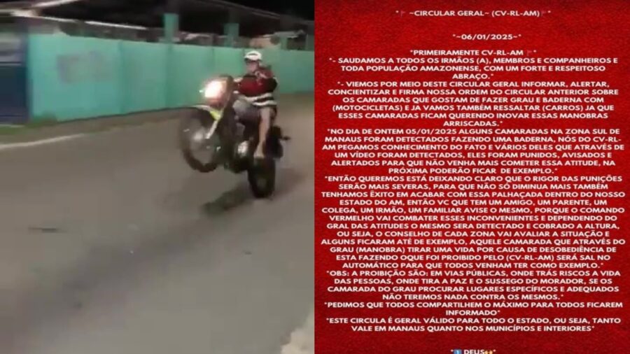 A facção Comando Vermelho emitiu recentemente um comunicado alarmante, informando que tomará medidas contra os motoqueiros barulhentos e inconvenientes que têm tirado a paz da população de Manaus. No texto, a facção anuncia que vai “combater” os motociclistas, prometendo aplicar “correções” para pôr fim ao que chamam de distúrbios causados pelo barulho excessivo das motos nas ruas da cidade.