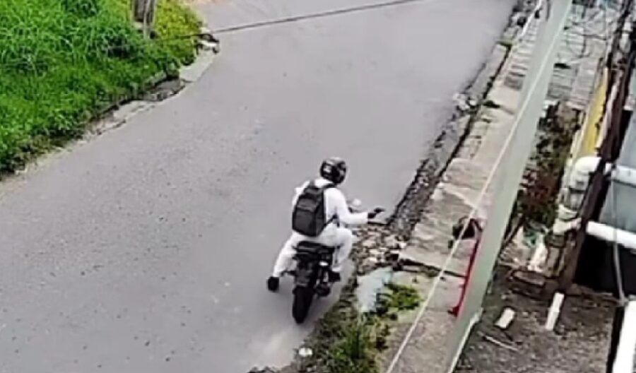 Durante o confronto, o assaltante consegue ligar a motocicleta e arrasta a vítima pela rua, que cai e é socorrida por pessoas que passavam no local.