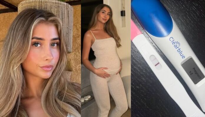 Além da foto na qual posa segurando sua barriga, ela também divulgou imagens de dois testes de gravidez lado a lado, com o teste digital marcando “1-2 semanas”.