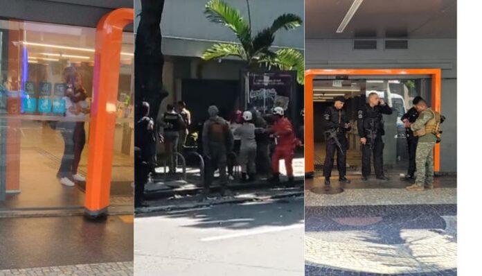 Vídeo mostra momento em que agentes do Bope resgatam mulher feita refém por homem em situação de rua em banco no Leblon, na Zona Sul.