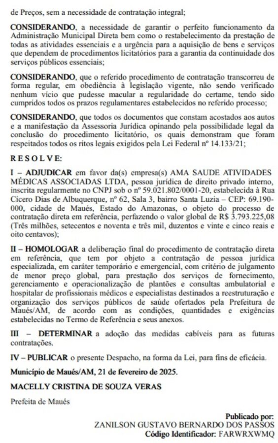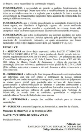 O contrato prevê a contratação de médicos e especialistas para atuar em plantões, consultas ambulatoriais e hospitalares, com o objetivo de reestruturar a saúde pública do município. Segundo a Prefeitura de Maués, a medida busca “garantir o funcionamento eficiente da administração municipal”.
