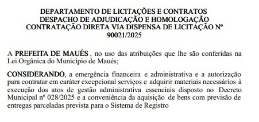 Somente em fevereiro, a Prefeitura de Maués já realizou mais de cinco contratações sem licitação, somando um total aproximado de R$ 15,5 milhões. Os valores chamam a atenção, assim como a agilidade com que os contratos foram firmados, levantando questionamentos sobre a transparência e os critérios utilizados nas dispensas.