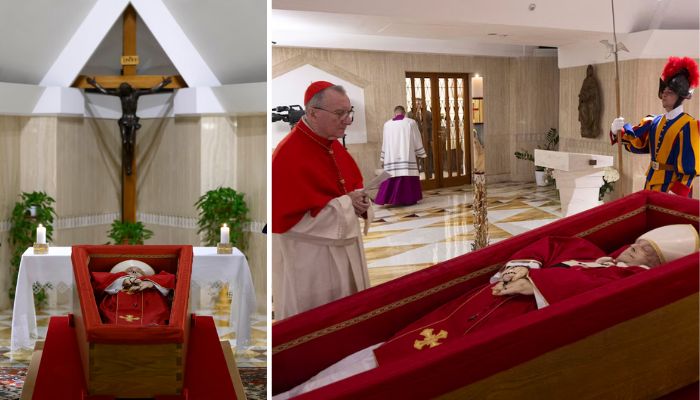 Francisco repousa em um caixão de madeira forrado com veludo vermelho, posicionado na capela privada de sua residência, onde permaneceu rodeado por seus colaboradores mais próximos e vários cardeais presentes em Roma.