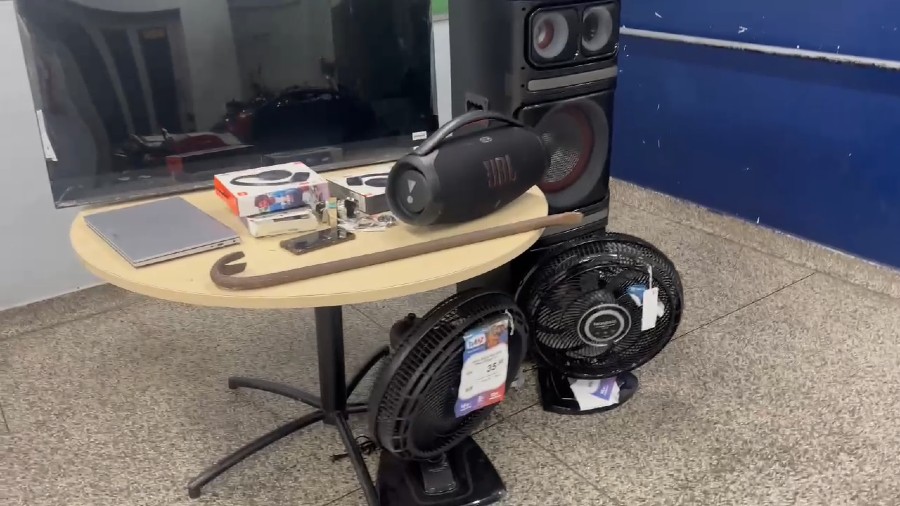 Com eles, foram encontrados diversos itens levados do local, entre eles: um notebook, dois fones de ouvido JBL, um tablet Lenovo, dois ventiladores, uma caixa JBL, quatro relógios prateados, uma TV de 50 polegadas, três caixas de som e um pé de cabra usado no arrombamento.