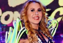 Ao bater os cabelos, a drag queen tentou saltar do palco em direção à plateia, mas acabou caindo no chão, pois os fãs não conseguiram segurá-la a tempo.