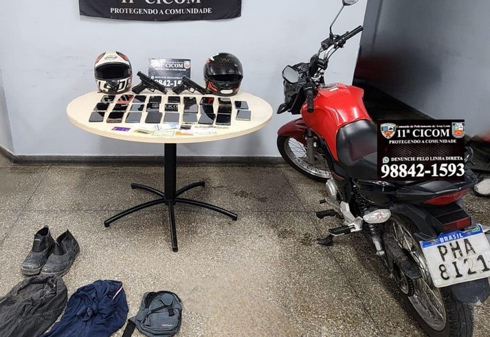 Entre os materiais apreendidos estavam 26 celulares, dois simulacros de arma de fogo, uma motocicleta Honda Fan 150 vermelha, além de cartões, documentos e roupas usadas nos crimes.