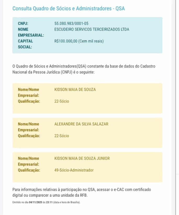De acordo com os registros oficiais, Kidson Maia de Souza Júnior, assessor parlamentar nomeado por Salazar, é também sócio do vereador na empresa Escudeiro Serviços Terceirizados LTDA, conforme dados da Receita Federal. A relação entre o parlamentar e o servidor levanta dúvidas sobre possíveis violações aos princípios da moralidade e impessoalidade que regem a administração pública.