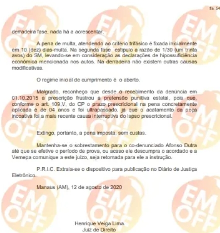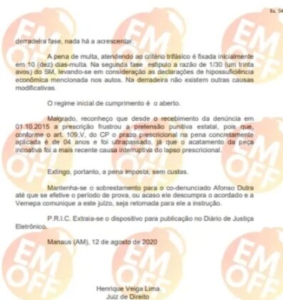 Apesar do reconhecimento do crime e da condenação a um ano de reclusão em regime aberto, a pena não chegou a ser cumprida. O processo, iniciado em 2015, teve a sentença publicada em 2020, o que levou o magistrado a declarar a prescrição da pena, ou seja, o prazo legal para a execução da condenação já havia expirado.