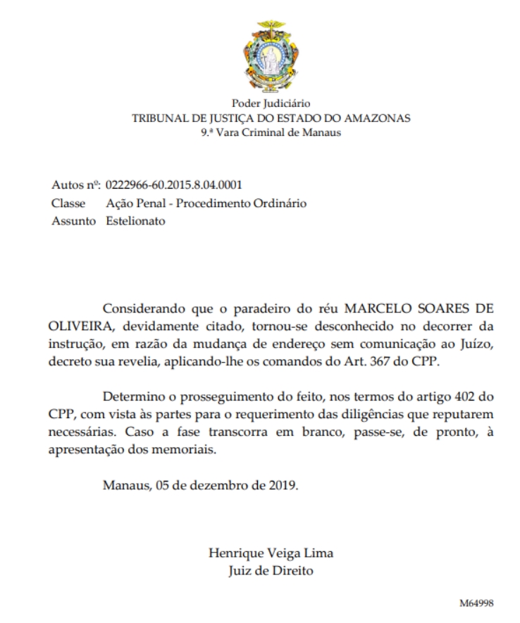A Justiça do Amazonas proferiu sentença condenatória contra Marcelo Soares de Oliveira, amplamente conhecido como Marcelo Generoso, pelo crime de estelionato (Artigo 171 do Código Penal).