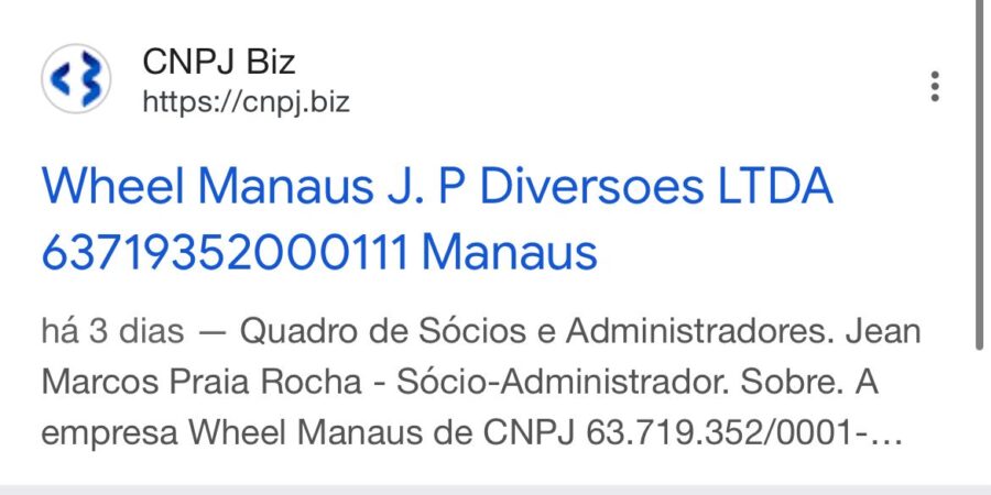Uma consulta detalhada ao cadastro da Wheel Manaus na Receita Federal revelou que a empresa foi constituída há apenas dois dias, com o CNPJ registrado em 18 de novembro de 2025 e um capital social de R$ 300 mil. A empresa está em nome do empresário Jean Marcos Praia Rocha.