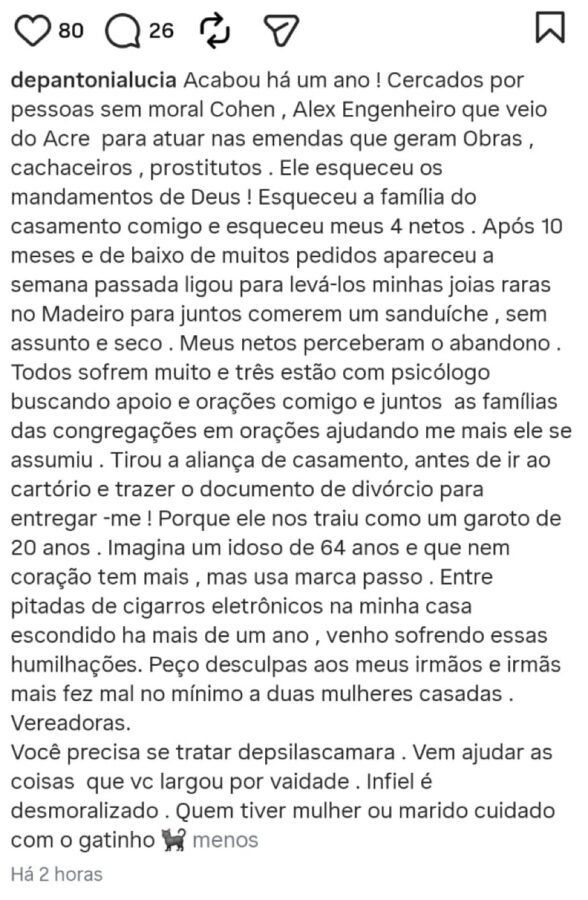 Além da acusação de traição, a parlamentar denunciou o abandono familiar e o impacto emocional na vida de seus entes queridos. Segundo ela, o deputado teria se afastado da família e dos netos, chegando a passar dez meses sem contato com as crianças. Antônia Lúcia ressaltou que três de seus netos estão em acompanhamento psicológico devido à situação.