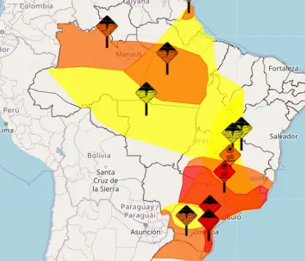 Dois alertas tratam do calor extremo. O alerta vermelho vale até as 18h desta terça e atinge quase todo o Estado de São Paulo, Rio de Janeiro, sul do Espírito Santo, sul e oeste de Minas Gerais, leste do Mato Grosso do Sul e sul de Goiás. Nessas áreas, a temperatura deve ficar 5°C acima da média por mais de cinco dias. Já o alerta laranja de onda de calor abrange o centro do Espírito Santo e de Minas, além de parte de Goiás, com altas temperaturas por até três dias.
