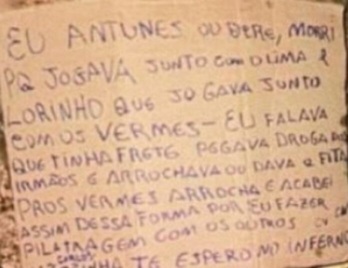 O cadáver foi localizado em um ponto de difícil acesso. No bilhete deixado junto ao corpo, os autores fazem referência a envolvimento com tráfico de drogas, conflitos internos entre criminosos e citam termos usados por facções para se referir a policiais, indicando que a execução teria sido motivada por disputas e desconfiança dentro do meio criminoso.