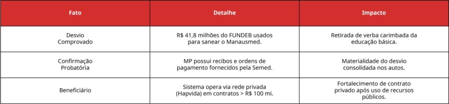 O Inquérito Civil nº 06.2025.00000465-7, que apura sua conduta, ganhou um novo e decisivo capítulo: a própria Secretaria Municipal de Educação (Semed) entregou ao MPAM uma farta documentação que atesta o desvio de finalidade de R$ 41,8 milhões do Fundo de Manutenção e Desenvolvimento da Educação Básica (FUNDEB), verba que deveria ser aplicada na educação, mas foi direcionada para o sistema de saúde. Clique aqui e confira: DOC