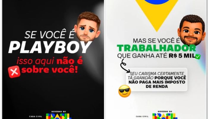 A primeira imagem dizia: “Se você é um playboy, isso aqui não é sobre você”. Já a segunda trazia outra frase: “Mas se você é trabalhador e ganha até R$ 5 mil, seu carisma certamente tá grandão porque você não paga mais imposto de renda”.