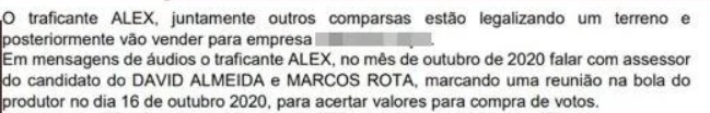 O documento, de autoria do Advogado Leôncio Paes de Carvalho, baseia-se em um dossiê elaborado pela Secretaria de Segurança Pública. O relatório aponta que, durante a campanha de 2020, teriam sido destinados cerca de R$ 70 mil a integrantes da facção em troca de apoio em comunidades dominadas pelo tráfico.