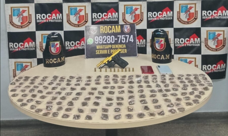 Na revista, os militares encontraram uma pistola Taurus calibre .380 com numeração raspada, dez munições intactas e 178 porções de material semelhante à maconha. Segundo a corporação, o homem já possui passagens por roubo e homicídio.