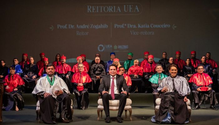 Eleitos pela comunidade acadêmica para mais um mandato à frente da gestão superior da Universidade do Estado do Amazonas (UEA), o Prof. Dr. André Zogahib e a Prof.ª Dra. Katia Couceiro foram empossados, na noite desta terça-feira (7/4), nos cargos de reitor e vice-reitora, respectivamente. A cerimônia foi realizada no Teatro Amazonas, reunindo autoridades públicas, gestores, familiares e docentes.