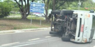 Caminhão baú capota na Avenida Santos Dumont e causa engarrafamento no Tarumã em Manaus