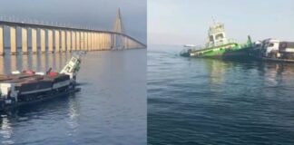Empurrador naufraga próximo à Ponte Phelippe Daou e cena viraliza nas redes sociais em Manaus