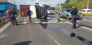 Carreta tomba na Avenida das Torres e interdita trânsito na Zona Norte de Manaus