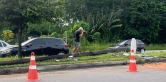 Veículo colide e derruba poste na Avenida Torquato Tapajós em Manaus