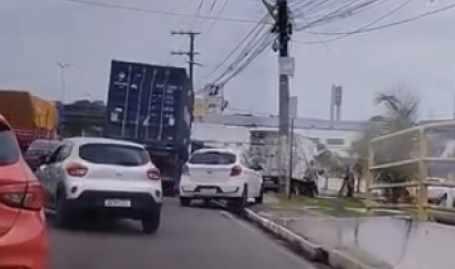 [Vídeo]: Contêiner se desprende de caminhão na Avenida Torquato Tapajós em Manaus