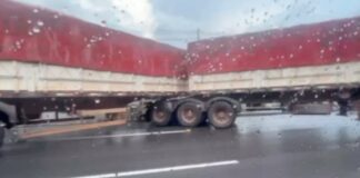 Carreta fica “atravessada” no meio da Avenida das Flores após derrapar na chuva em Manaus