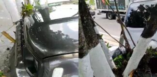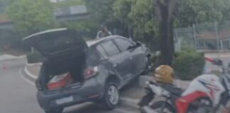 Veículo fica destruído após colidir contra árvore em frente à universidade em Manaus