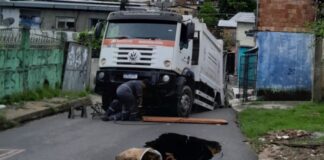 Caminhão de Lixo despenca em cratera após asfalto ceder na Zona Leste de Manaus