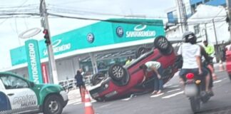 Veículo perde controle e capota no meio de via pública no Centro de Manaus
