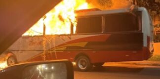 Ônibus da Rota pega fogo na Avenida Rodrigo Otávio e fica totalmente destruído em Manaus