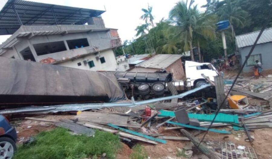 [Vídeo]: Carreta colide contra veículo e residência na Zona Sul de Manaus