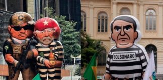 Ausência de Lula e Bolsonaro é simbolizada por “Luleco” e “Bolsoleco” como presidiários